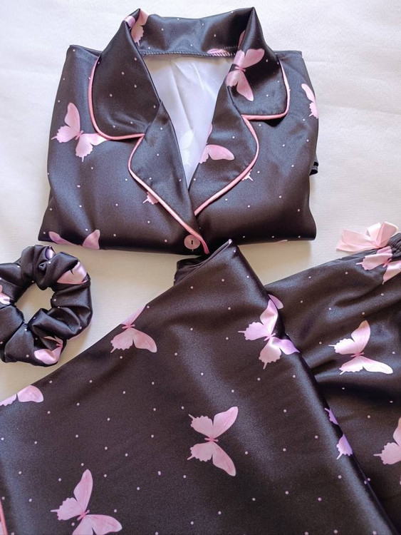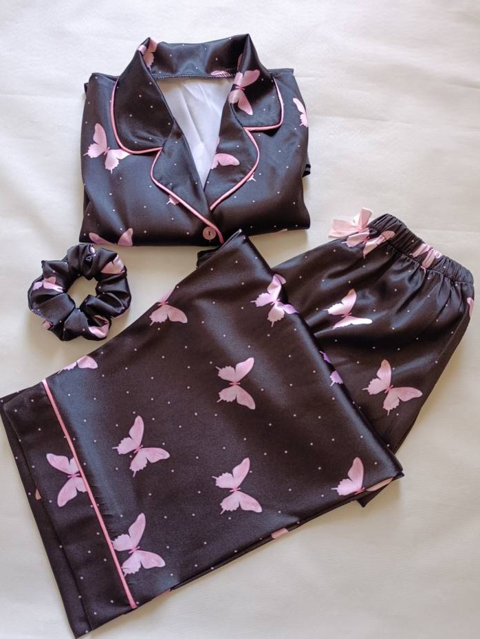 لباس خواب زنانه- بلوز و شلوار ساتن طرح پروانه (مشکی و صورتی)