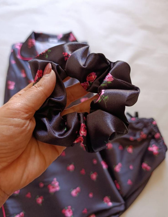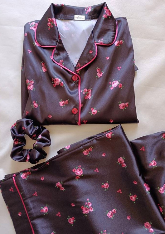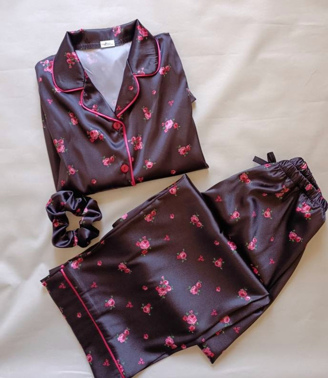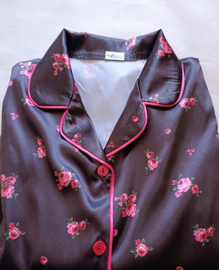 لباس خواب زنانه- بلوز و شلوار ساتن طرح گل سرخ