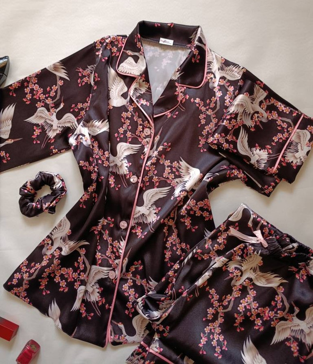 لباس خواب زنانه- بلوز آستین بلند و شلوار ساتن طرح پرنده ژاپنی