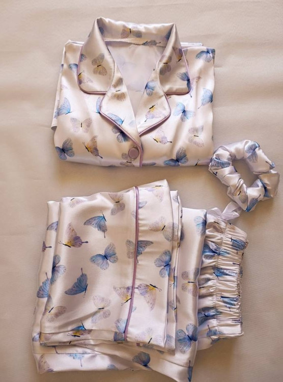 لباس خواب زنانه- بلوز و شلوار ساتن طرح پروانه های آبی با زمینه سفید