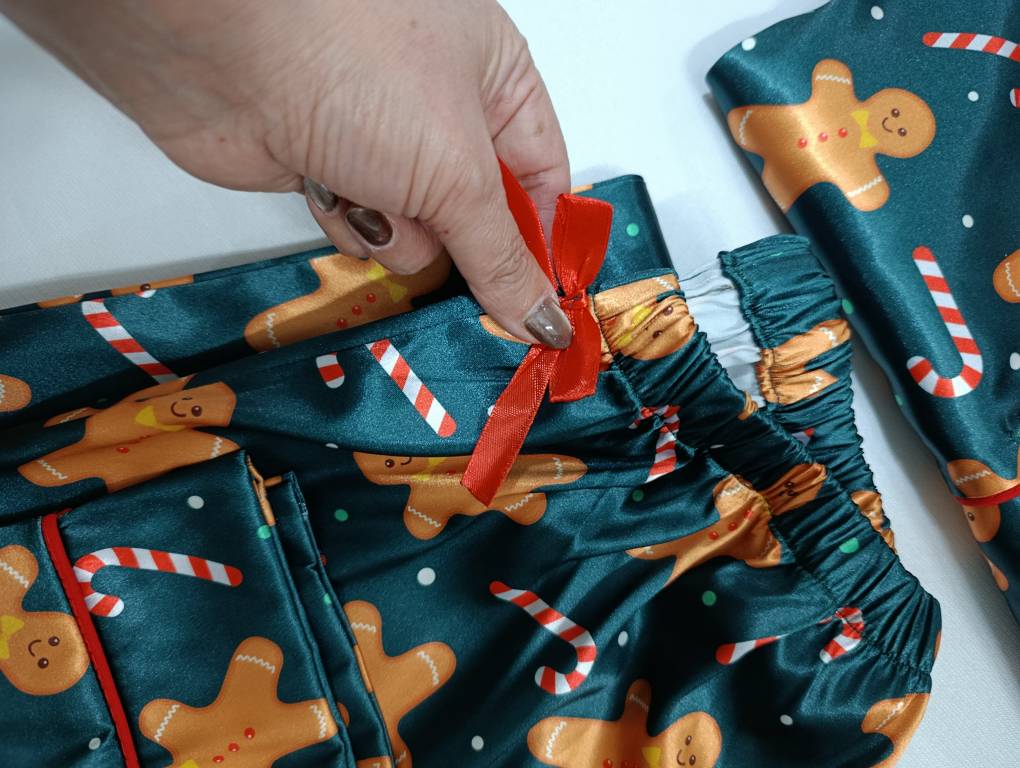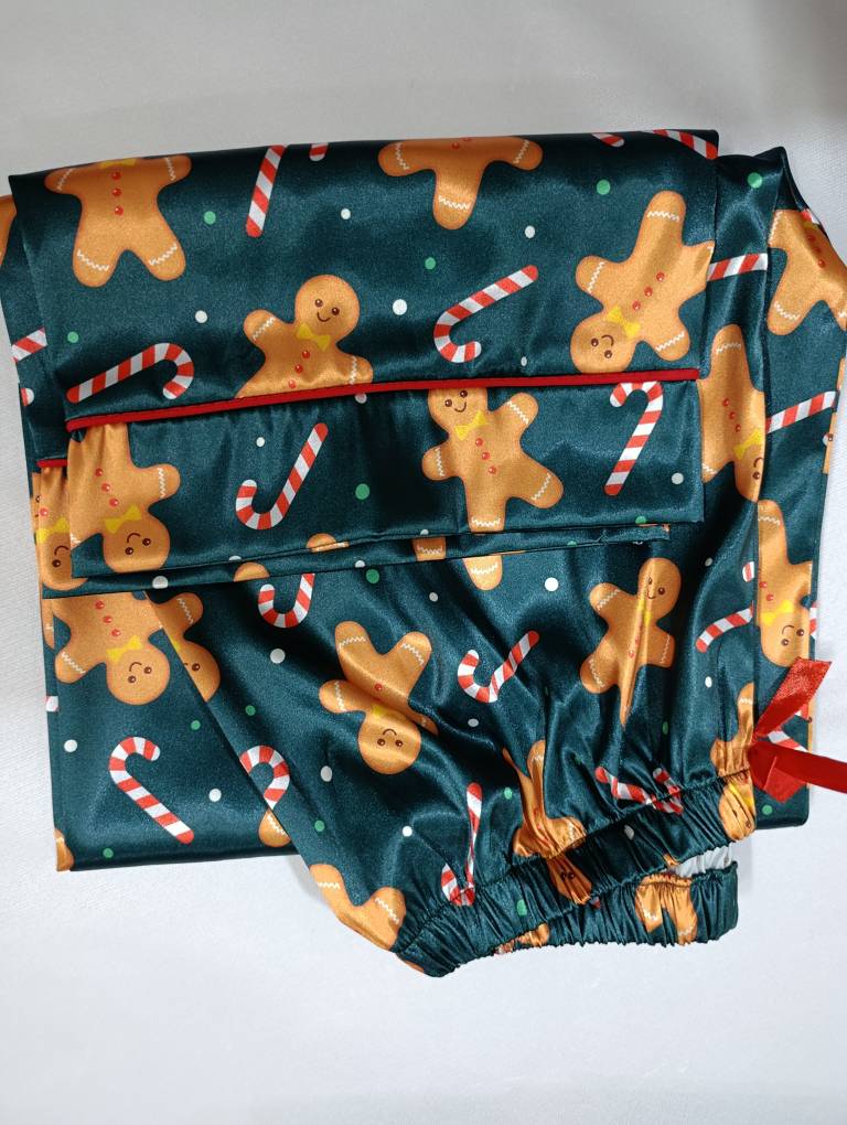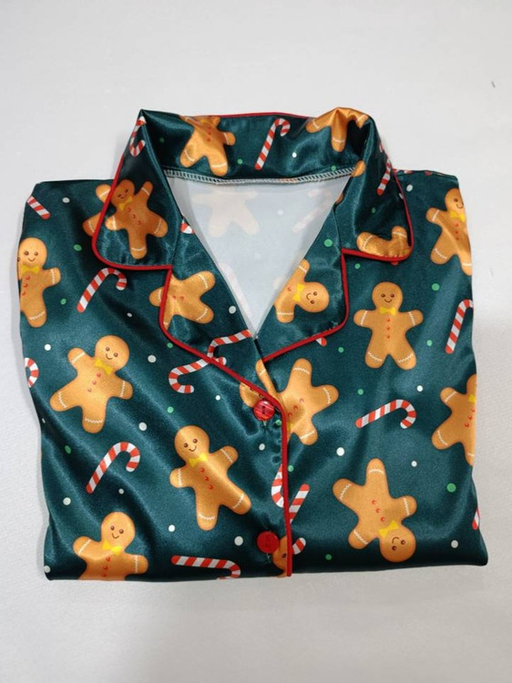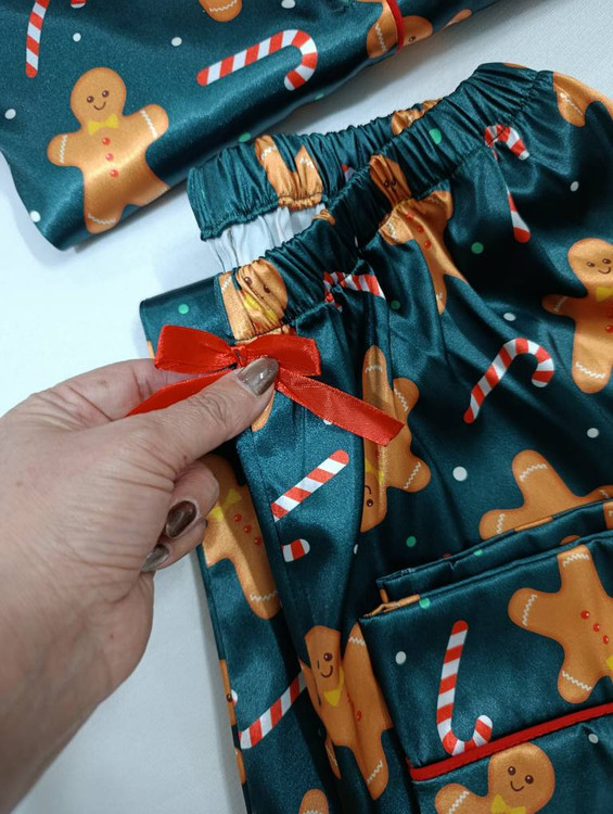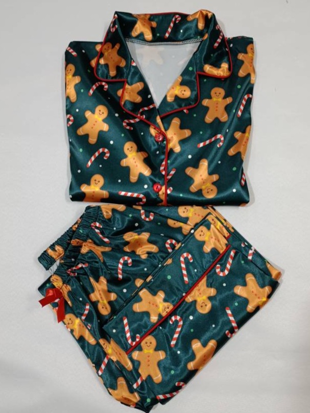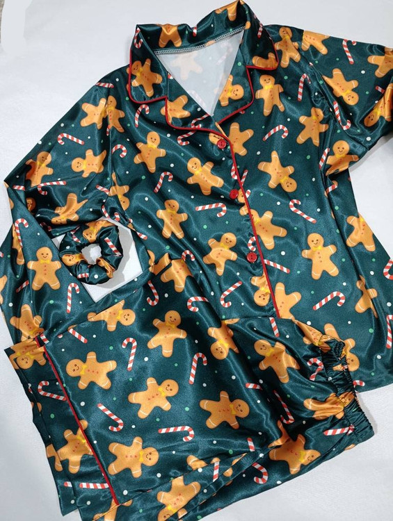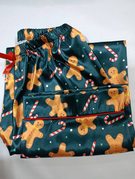 لباس خواب زنانه- بلوز و شلوار ساتن طرح کوکی زنجبیلی کریسمس