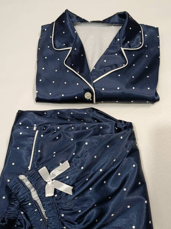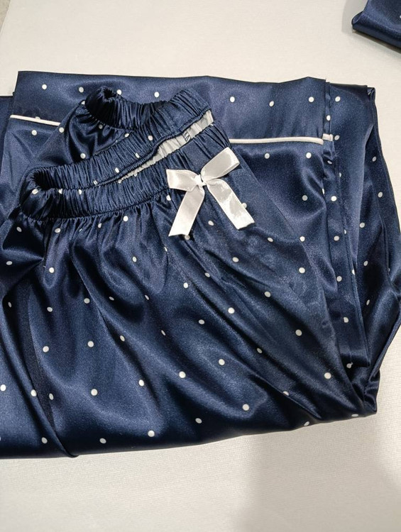 لباس خواب زنانه- بلوز و شلوار ساتن طرح خالخالی سرمه ای و سفید