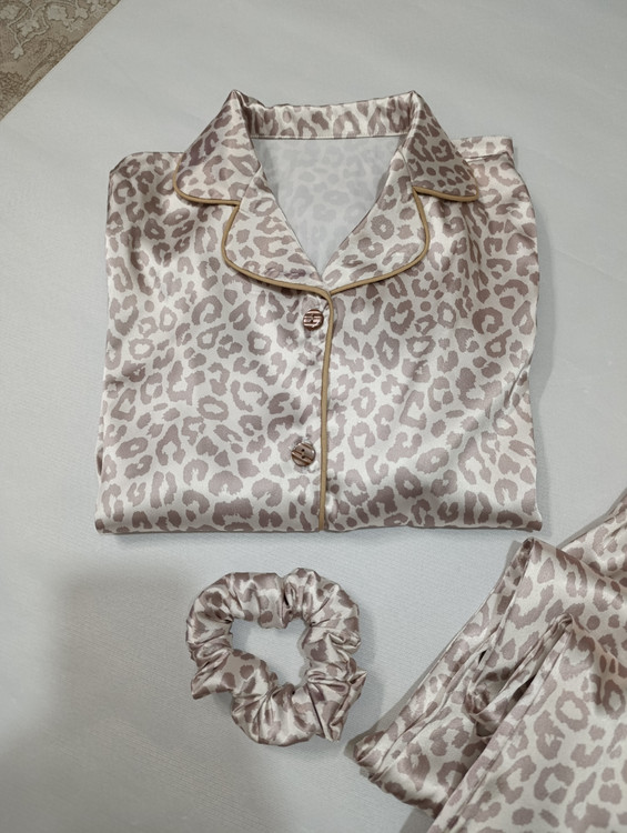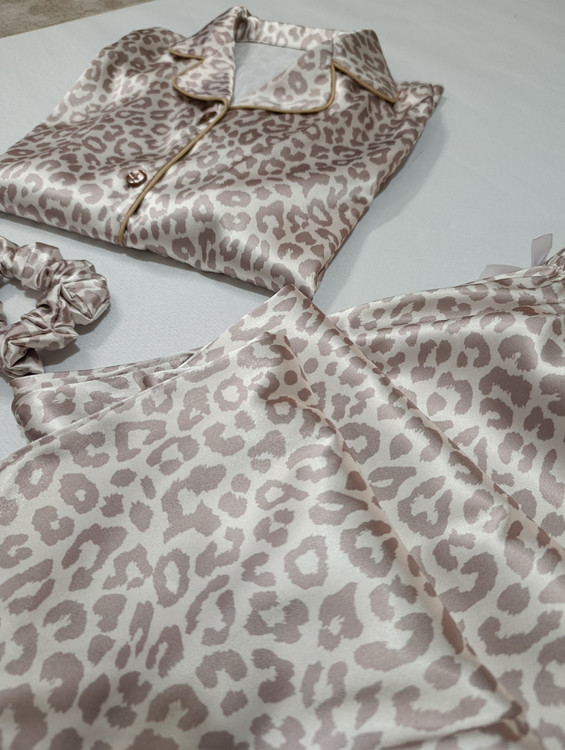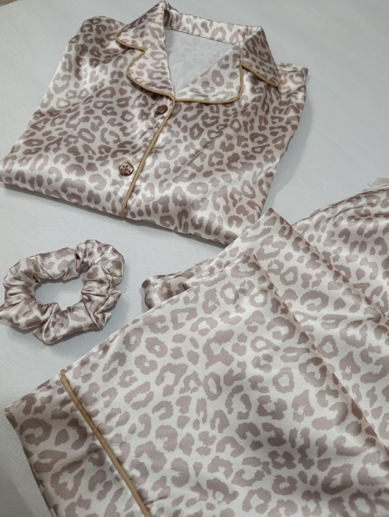 لباس خواب زنانه- بلوز و شلوار پلنگی کرم و نسکافه ای